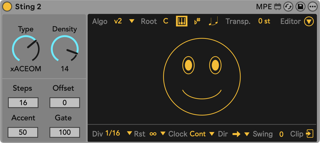 The new version of Sting is an expressive, improvisational acid line performance system. It is a Max for Live device that runs on Ableton Live or Push 3 Standalone. Sting can generate anything from random to acid patterns and morph between them fluidly. It features a new generation algorithm, advanced editing, expressive control, generative sequencing, and modulation capabilities, along with a set of live performance oriented features. These include a dedicated Push takeover mode that transforms Sting into a hands-on live performance system when used with Ableton Push 2 or 3.